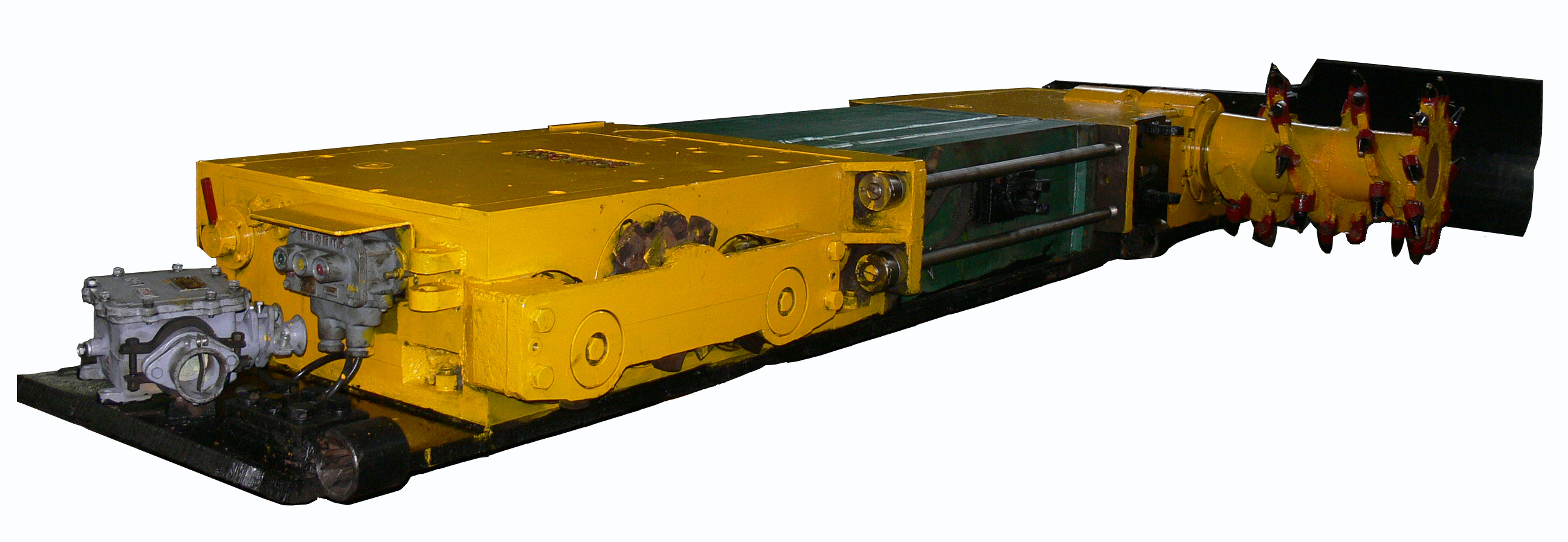 MG100-TP(YRG3)型極薄煤層單滾筒爬底板采煤機。機身矮、短、窄,機身高度380mm(局部425mm含底船),機身長3848mm,機身寬910mm,用于煤層厚度為0.5~0.9m,煤質(zhì)中硬(f≤3),傾角<300的煤層,當(dāng)傾角>150時,機器要增加防滑絞車。