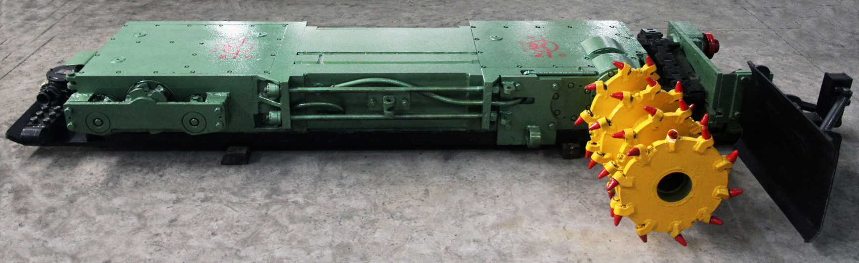 MG100—TP(YRG4型)型極薄煤層單滾筒爬底板采煤機(jī)。該采煤機(jī)適用于煤層厚度為0.5~0.95m,煤質(zhì)中硬(f≤3) 傾角<30°的煤層,當(dāng)傾角>15°時(shí),機(jī)器要增加防滑絞車。該機(jī)采用液壓傳動(dòng)、錨鏈牽引、無極調(diào)速,操作簡(jiǎn)單。該機(jī)與SGD420/22或SGB420/30型刮板輸送機(jī)、單體液壓支柱配套使用,具有功率大,整機(jī)強(qiáng)度高,可靠性高,安全有保障等特點(diǎn),可實(shí)現(xiàn)極薄煤層普采工作面機(jī)械化開采。
