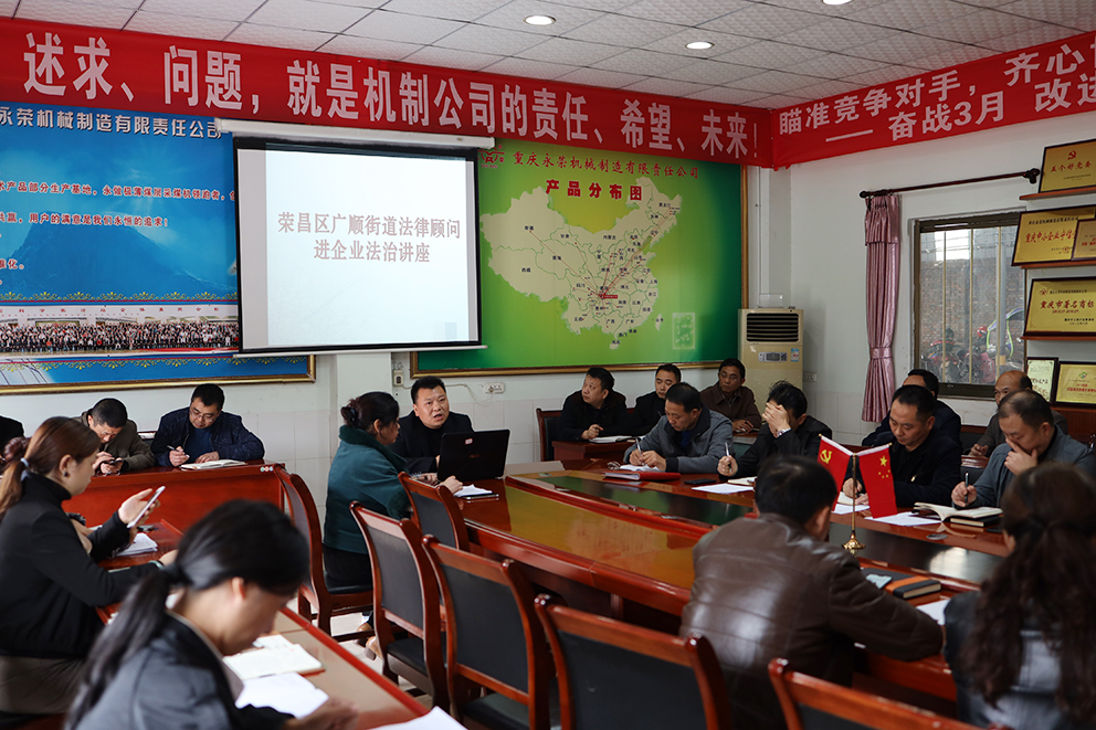 11月11日,榮昌廣順?biāo)痉ㄋ芩L(zhǎng)、鄧主任來(lái)到永榮機(jī)制公司開(kāi)展普法講座,該公司領(lǐng)導(dǎo)、中干共21人接受普法知識(shí)教育。該公司董事長(zhǎng)、黨委書(shū)記蒲江平到現(xiàn)場(chǎng)聽(tīng)講,并對(duì)廣順?biāo)痉ㄋ辗ㄟM(jìn)企業(yè)表示感謝。蒲董事長(zhǎng)指出,企業(yè)在改革發(fā)展進(jìn)程中正需要這樣的講座來(lái)規(guī)范管理人員行為,幫助企業(yè)依法發(fā)展,并希望與廣順?biāo)痉ㄋ3致?lián)系,提供更多的機(jī)會(huì)保證相關(guān)法律規(guī)定入腦入心,指導(dǎo)實(shí)際工作。