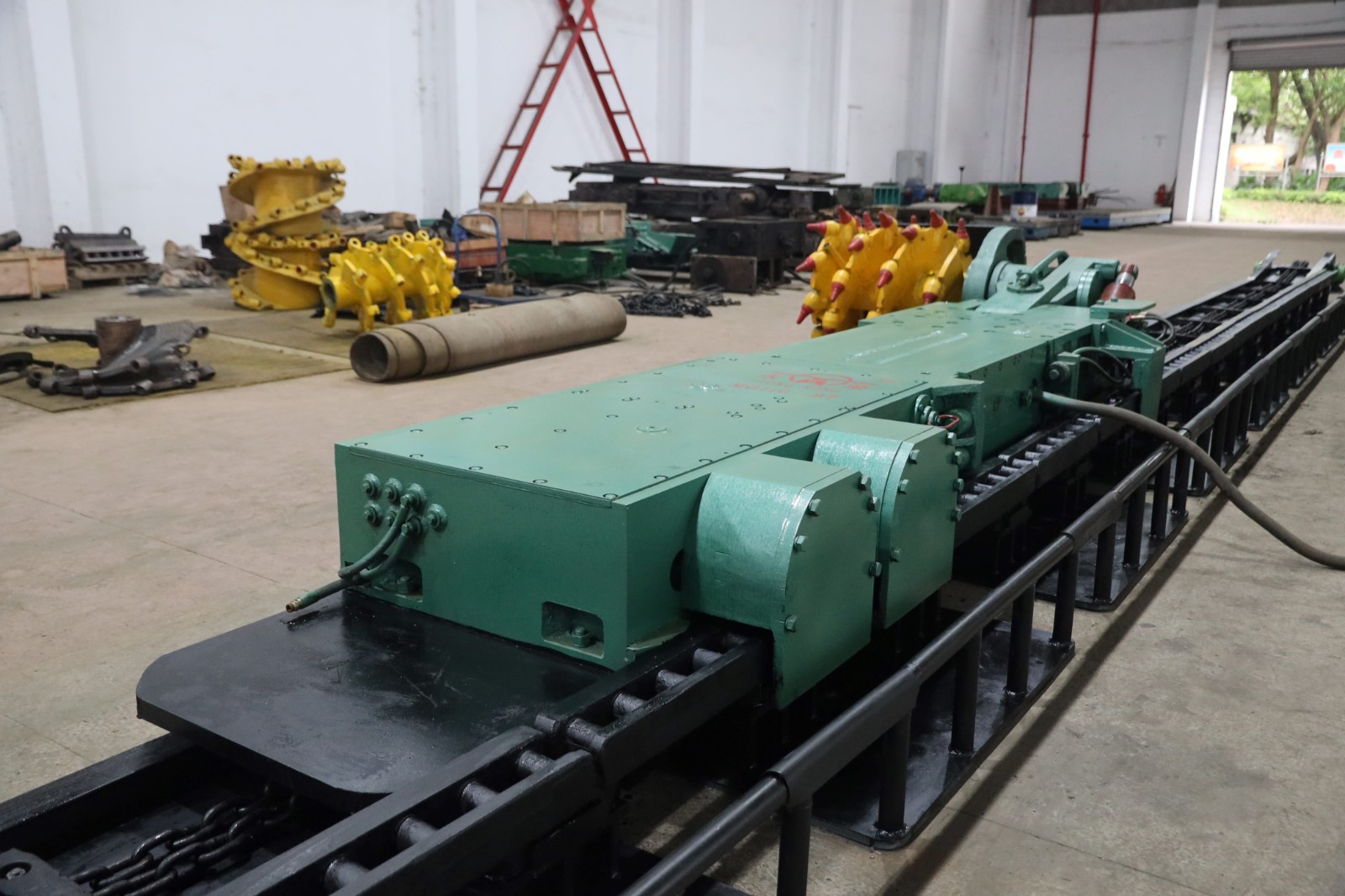 使用范圍 該型采煤機適用于采高0.8-1.7m,傾角小于30°,煤質(zhì)硬度小于3.5,含有少量夾矸的長壁式工作面。該機采用無級變速液壓牽引,銷軌行走,整機原裝進口液壓元件,技術(shù)成熟可靠,運行平穩(wěn),無故障運行同行領(lǐng)先,日常維護成本低。與刮板輸送機、單體液壓支柱和金屬頂梁配套使用,組成高檔普采工作面,初期投入少,見效快。還可采用無線遙控操作,降低工人勞動強度,提高開采效率。